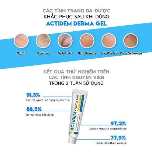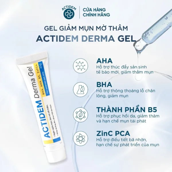 Gel giảm mụn Actidem Derma Gel là dòng dược mỹ phẩm dành cho da mụn với công năng chính giúp giảm các loại mụn ẩn, mụn li ti, mụn đầu đen,… đồng thời trải qua các cuộc khảo sát hàng loạt của đội ngũ chuyên gia, dược sĩ kiểm chứng chất lượng phục hồi ngăn ngừa thâm sau mụn an toàn lành tính thích hợp với mọi loại da.