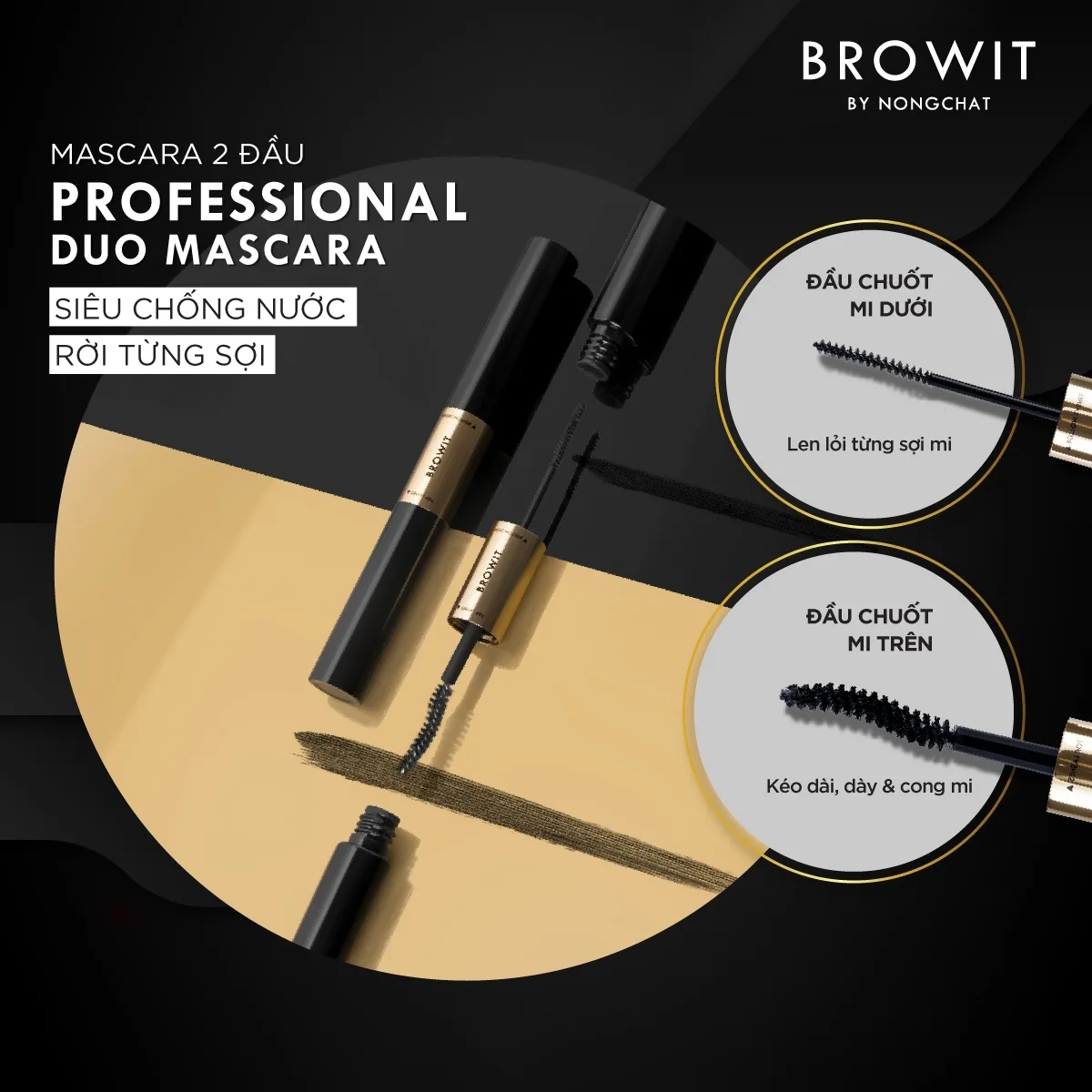 Mascara 2 Đầu Browit Professional Duo Màu Sexy Black 4 + 4g là sản phẩm mascara đến từ thương hiệu mỹ phẩm Browit của Thái Lan được thiết kế bởi chuyên viên trang điểm nổi tiếng Nongchat. Sản phẩm có công thức ngăn thấm nước, mồ hôi, đẹp cả ngày mà không lem. Cọ chuốt lông mi dưới với đầu đặc biệt nhỏ, dễ chuốt tới từng sợi cho lông mi nhìn dài, giúp đôi mắt trông đẹp tự nhiên.